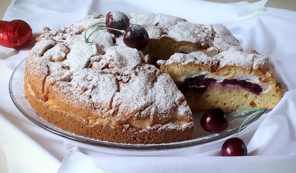 Ингредиенты: Для теста:, муки, яйца, сахара, Одна столовая ложка разрыхлителя, сливочного масла или маргарина, сметаны, Для начинки:, Две столовые ложки манки, сахарной пудры, Две столовые ложки сахара, Одна столовая ложка кокосовой стружки, вишни, лимонной кислоты, Одна столовая ложка крахмала Способ приготовления: Белки отделяем от желтков. Масло комнатной температуры растираем с сахаром. Добавляем остальные сухие ингредиенты и тщательно перетираем руками. Добавляем желтки и вымешиваем тесто. При необходимости постепенно добавляем сметану. Тесто делим на 2 части. 1 часть поменьше. Маленькую часть разделить на 4 шарика и убрать в морозилку на 30 минут. В охлаждённые яичные белки добавляем одну щепотку лимонной кислоты. Начинаем взбивать, постепенно увеличивая скорость венчика и добавляя сахарную пудру. За минуту до окончания взбивании белков добавляем крахмал. Белки взбиваем до крепких пиков. Вишню соединяем с сахаром. Основную часть теста равномерно выкладываем в форме для запекания