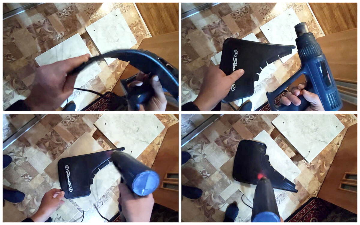 Сын сдал на права, пришлось раскошелиться на старенький Фольц. Но для прохождения ТО нужно было установить брызговики. Начали мотаться по магазинам, нигде нет, печаль, на разборке тоже не нашли. Заехали в один придорожный, а там есть, последние и по старой цене (300 ₽). Отлично, только одна беда, от долгого лежания они задубели и перекосились, надо исправлять. Как выпрямить Сразу возникла мысль, нагреть строительным феном и положить межу двумя ровными поверхностями пока остынет. С первым брызговиком так и сделал, но оказалось, что при прогреве пластик становится более эластичным и придавливать не надо. Достаточно, просто положить на ровную поверхность, кстати, если нет фена, можно просто подержать над газовой конфоркой, эффект будет тот же. Установка без снятия колёс Почему решил не снимать, во-первых, делал впервые, а во-вторых, у меня была угловая насадка. Добираться было неудобно даже с ней, пришлось чуть поднимать домкратом, чтобы получить лучший доступ. Сразу скажи, это была плох