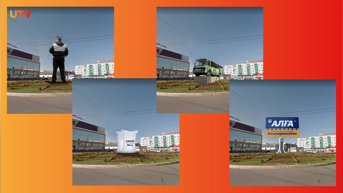 Новый мэр столицы Башкирии Ратмир Мавлиев объявил конкурс на лучший арт-объект, который заменит рекламную конструкцию, демонтированную на кольце около Центрального рынка. Победитель получит 300 тысяч рублей. Бывший глава Госавтоинспекции Башкирии, а ныне депутат Госдумы, Динар Гильмутдинов уже предложил установить на кольце памятник сотруднику дорожной полиции. Редакция телеканала UTV предложила свои варианты арт-объектов, среди которых инсталляция «Мешки с сахаром», памятник ПАЗику, маскот коня и куницы, предложенный в рамках разработки фирменного стиля Уфы к ее 450-летию дизайн-студией «Банан», и другие варианты. Памятник гаишнику Вариант, предложенный бывшим главой Госавтоинспекции. Памятник ПАЗику В рамках первого этапа транспортной реформы ПАЗики навсегда покинули дороги Уфы. Инсталляция «Мешки с сахаром» Отсылает нас к проблеме дефицита сахара в магазинах Уфы и роста цены на этот продукт. Инсталляция «Снеговик» Напомнит уфимцам, чтобы готовили лопаты к зиме еще летом. Инсталляция