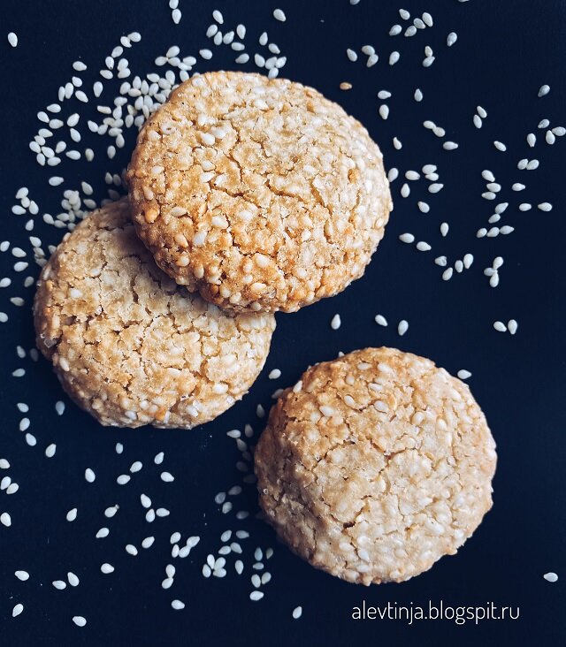Всем привет! Предлагаю вашему вниманию самое простое в приготовлении и самое быстрое в поедании - вкуснейшее кунжутное печенье. Рецепт подходит для вегетарианцев и постящихся, а также для тех, кто не употребляет глютен. По старой памяти дам наводку на ингредиенты, которые я покупала на iHerb. Знаю, что меня читают люди из разных стран, так что эта информация может вам пригодиться. А, вообще, продукты можно купить и в наших магазинах. Никто не запретит вам использовать безглютеновую муку от Гарнец вместо варианта от Bob's Red Mill. Так ведь? Надо: Сухие ингредиенты: 80 г кунжута (можно поджарить на сухой сковороде) 95 г муки без глютена 30-35 г кокосового сахара 1 г разрыхлителя . Жидкие ингредиенты: 35 г кокосового масла (растопить) 50 г растительного молока ( у меня миндальное) 1 ч.л.экстракта ванили Приготовление В миске соединить все сухие ингредиенты, затем добавить жидкие, хорошо перемешать, замесить тесто.