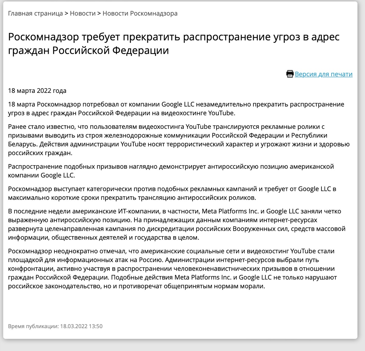 Слухи и новости о возможной блокировки YouTube ходят уже 2 недели точно. Хоть и видеохостинг старается не портить отношения с РФ. Получается у него это не очень. Сегодня РИА Новости написали: YouTube в России могут заблокировать до конца следующей недели, возможно, уже сегодня Как вам такой "шок-контент"? Но с чем же это связано? Давайте разбираться👇🏼 Роскомнадзор выступил с требованием к компании Google LLC незамедлительно прекратить распространение угроз в адрес граждан Российской Федерации на видеохостинге YouTube. А именно антироссийских роликов. Подробнее в картинке👇🏼 Как отреагирует руководство YouTube и что будет дальше? Неизвестно 😱 Будем ждать ответной реакции) Как вы думаете YouTube останется с нами? #youtube #smm #продвижение в соцсетях #смм продвижение #смм #сммблог #роскомнадзор