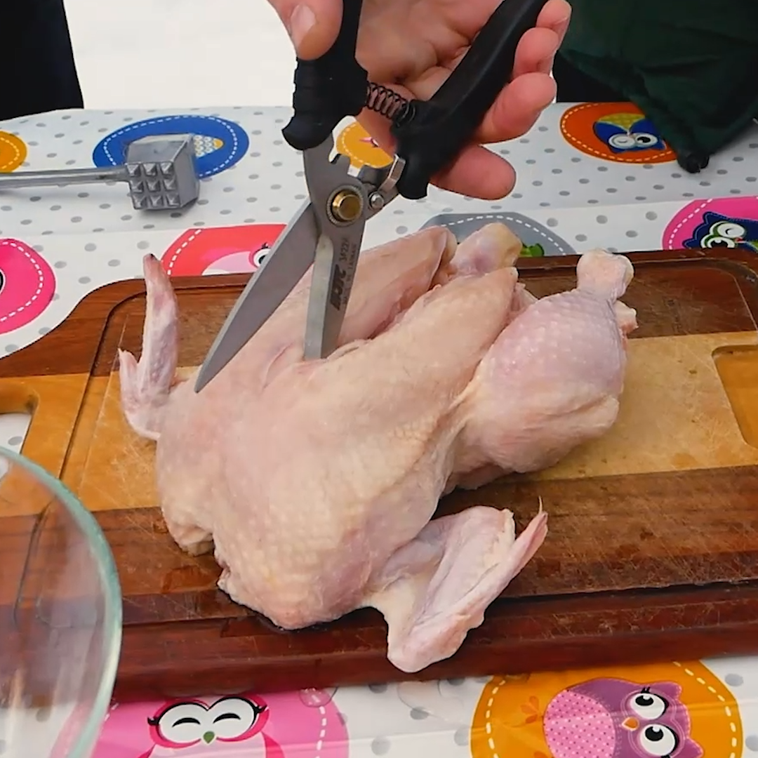 А теперь подробнее: Мальчик и леший решили сделать романтический ужин-сюрприз для Бабы Яги. Берем курицу и разрезаем ее по грудине, сказал мальчик. Леший оказался безруким и очень брезгливым, он очень боялся дотронуться до куриной тушки, ему было страшно до нее дотронуться, и поэтому он переворачивал ее ножницами. Он разрезал куриную грудь и перевернул ее. Мальчик показал пример, что следует делать дальше, взял молоток и начал ее отбивать, далее протянул Лешему молоток тот поморщился, но все же продолжил приготовление тушки. Далее смешиваем мелконарезанный чеснок и соль и пальчиками начинаем запихивать эту смесь под куриную кожу, перчим тушку и делаем ей массаж с подсолнечным маслом. Леший сильно страдал, но все же пересилил себя и справился с поставленной задачей. Далее отправляем курицу на разогретую сковороду под пресс и обжариваем с каждой стороны по 20 минут. А пока она готовиться мальчик и леший решили приготовить витаминный букет из чеснока и жгучего перца. Романтический ужин и