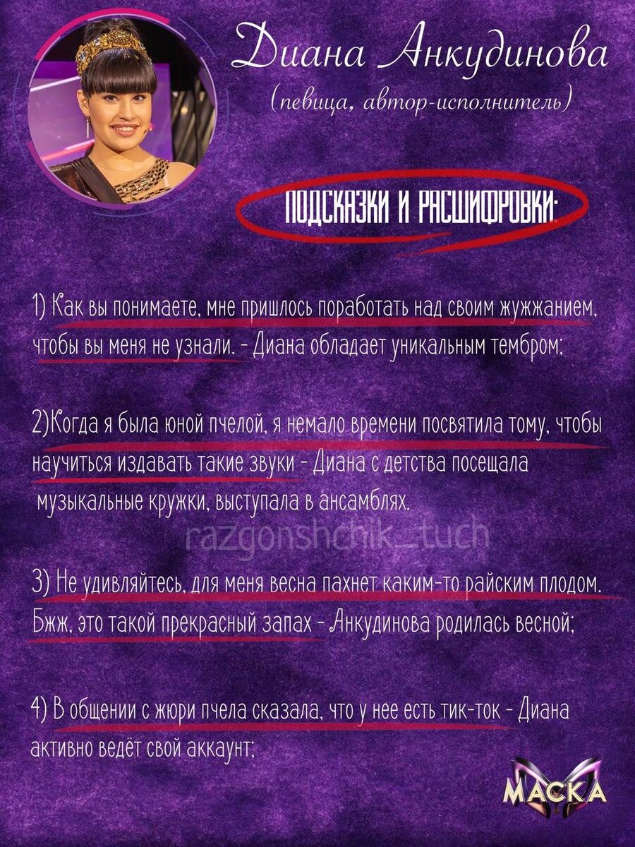 Всем привет! Делимся с Вами расшифровкой подсказок к Диане Анкудиновой 🐝 Наше мнение: ✅Подсказки Диане подходят; ✅В некоторых песнях голос был похож на Анкудинову; ⭕️Поведение на Диану не очень похоже, но все мы знаем, как маска может раскрывать людей; ❌ В одной из программ пчела обратилась к Валерии на ты и назвала ее Лерочкой - несмотря на то, что на «ШоуМаскГоОн» Диана со всеми общалась на ты, не думаем, что она бы так обратилась к Валерии; ❌Была отмечена в stories Instagram других людей в ресторане во время съёмок 2 выпуска - не думаем, что Диана бы успела на съёмку; ❌Была в зале на съёмках первого выпуска - сначала мы подумали, что это может быть отвлекающим маневром, но теперь понимаем, что Дианы просто нет в маске и она приходила исключительно, как зритель. Есть ли у вас что добавить? Делитесь своим мнением, оставляйте комментарии и реакции, если вам нравится такой формат разбора❤️