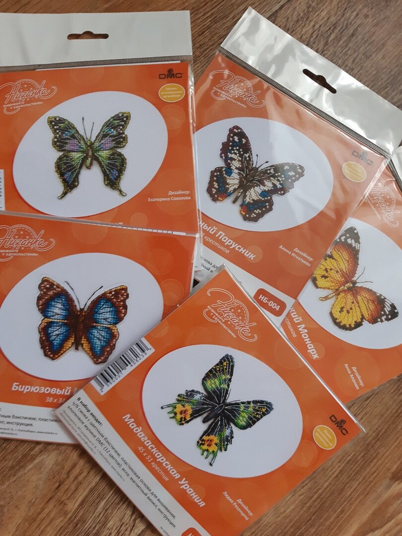 Бабочек от ныне уже не существующей студии "Низанка" я увидела пару лет назад на канале Алексея AlexStitch и поняла: хочу! мне надо! сразу всех! Ибо серия - значит серия:) Увидела и сразу же пошла искать их по рукодельным интернет-магазинам. Видимо, бабочки оказались какими-то весьма редкими экземплярами, т.к, во-первых, пришлось собирать их по нескольким магазинам, и, во-вторых, стоили они как крыло самолета, что, впрочем, ничуть меня не остановило. Таким образом, я стала счастливой обладательницей всей коллекции магнитов из 9 штук. Вышивались бабурочки у меня в течение года как маленькие процессы-отдыхалочки от основных работ. Вышивала по-порядку, и первой на очереди оказалась"Графия Веска" За ней последовал "Жёлтый Стеклянный Тигр": С третьей бабочкой "Парусник Кирказоновый" пришлось немного помучиться. Почему? А вот почему: в наборе 11 цветов мулине, и большая часть из них ооочень близких оттенков. А вышивать бэк коричневыми нитками на равномерно коричневой бабочке - это, знаете