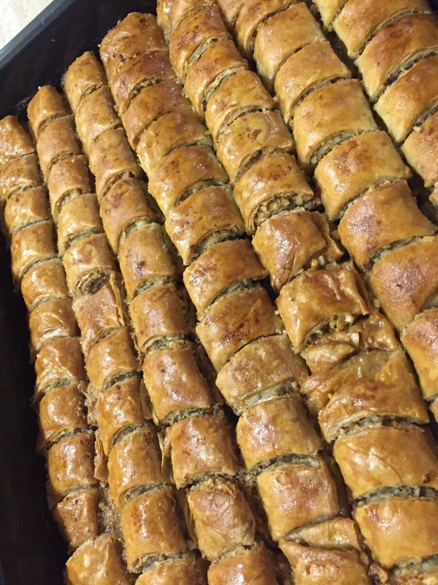 Эта пахлава у нас стоит очень дорого, поэтому я готовлю её сама дома. Почему бы и нет? Наш край богат на грецкие орехи, грех не печь эту пахлаву самому. #пахлава #турецкаяпахлава #грецкийорех Ингредиенты: Тесто, яйца, растительного масла, воды, соли, муки, Дополнительно, грецких орехов (можно ещё фундук), сахара, крахмал картофельный, растопленного сливочного масла, Сироп, сахара, воды, лимонного сока Способ приготовления: Для теста смешиваем яйца, растительное масло, соль, воду, хорошо перемешиваем и постепенно добавляем просеянную муку. Замешиваем мягкое не липнущее тесто. Заворачиваем его в плёнку и убираем в сторону на 1 ч. Для начинки измельчаем орехи в блендере, но не сильно. К орехам добавляем 1 стакан сахара и перемешиваем. Отдохнувшее тесто делим на 4 части и раскатываем круги с помощью крахмала. Тесто раскатываем как можно тоньше. Каждый круг смазываем растопленным сливочным маслом и посыпаем орехами. Заворачиваем в рулет. Пахлаву я нарезала кружкой (той стороной откуда пьем)