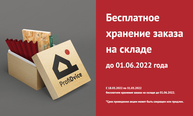 💥 Покупай и Храни товар у нас на складе БЕСПЛАТНО! 💰️ Единственным условием акции будет 100% оплата заказа. Срок действия акции распространяется на покупки материалов в нашей компании оформленные: с 18.03.2022 по 31.03.2022. Бесплатное хранение на складе возможно до 01.06.2022г. включительно. Срок проведения и условий акции может быть изменён на усмотрение администрации. _ _ _ _ _ _ _ _ _ _ _ _ _ _ _ _ _ _ _ _ _ Задай вопрос профессионалам прямо сейчас! Материалы для крыши, фасада и ограждений! Замер, расчёт и выезд на объект бесплатно! ----------------------------------- Как связаться с #profidvice? 📞 +7(915) 263 63 63 WhatsApp, Viber, Telegram 📩 info@ProfiDvice.ru 🚚 Доставка по РФ!