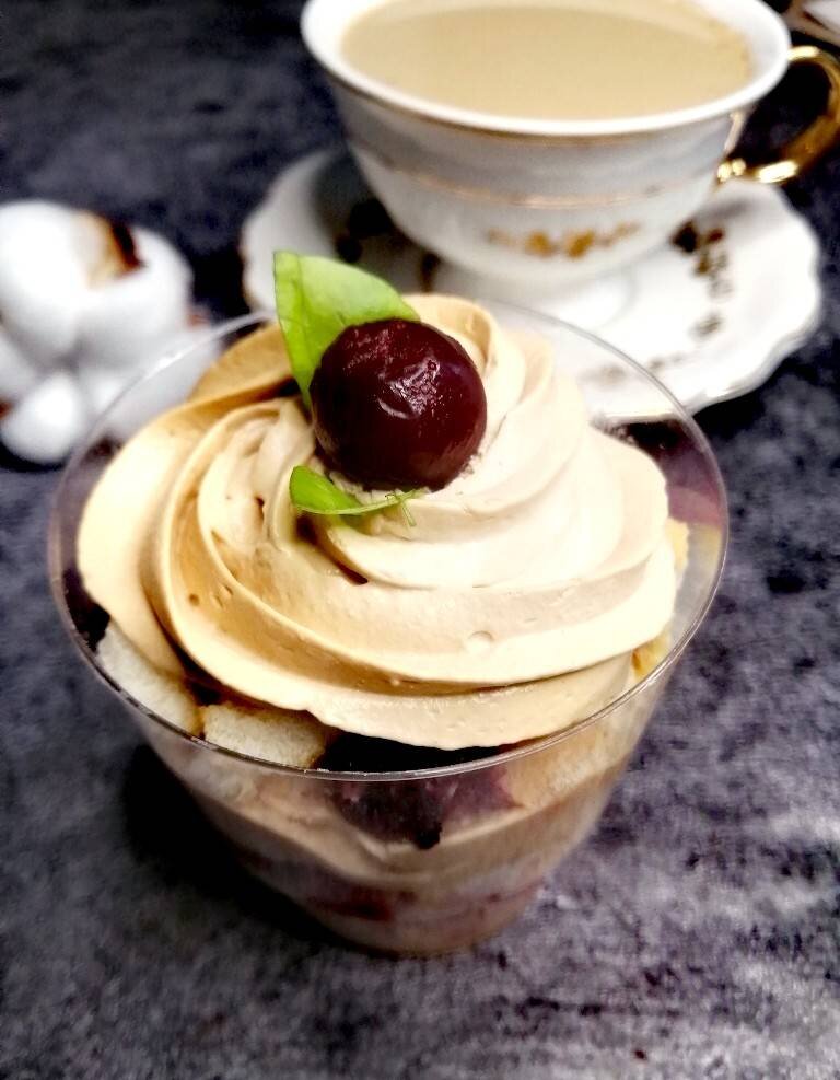 #меню Десерт на скорую руку без выпечки. Особый вкус крему придает творог из топленого молока. Можно заменить на обычный пастообразный творог или творожный сыр. Ингредиенты: творога из топленого молока, сливок 33-35 %, м. л подсластителя Пребиосвит (или сахарная пудра по вкусу), Вишня, печенья Савоярди Способ приготовления: Творог соединяем с подсластителем и сливками. Взбиваем. Перекладываем крем в кондитерский мешок. Печенье измельчаем. На дно стакана выдавливаем немного крема, на крем выкладываем часть печенья, вишню. Затем повторяем. Верхний слой - крем. Украшаем по своему усмотрению. Убираем в холодильник на пару часов. P. S 1 м. л подсластителя Пребиосвит = 10 г сахара. Вишня у меня замороженная, предварительно не размораживала.