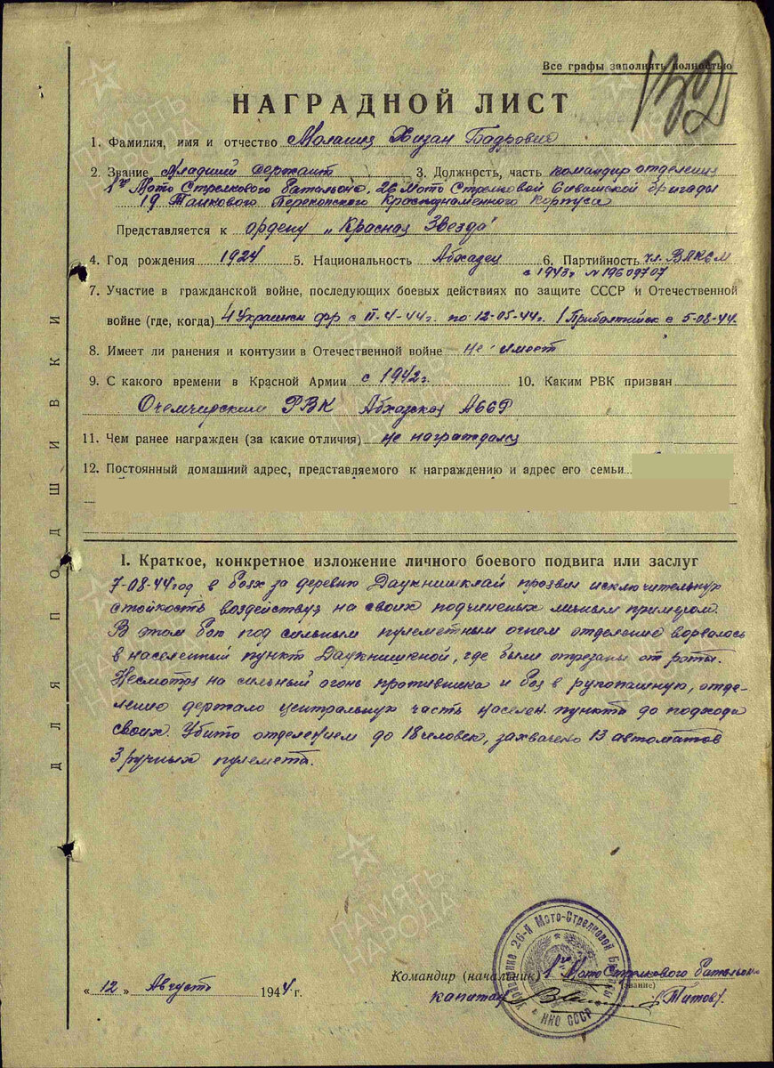 Малания Хизан Бадрович 1924 г #абхазец уроженец Очамчирского района,#Абхазия .Участник #Великой #Отечественной #войны .Командир отделения,младший сержант.На фронте с 1942 г. 7.08.1944 в бою под сильным пулеметным огнем,вместе со своим отделением ворвался в населенный пункт Даукнишкной,где был отрезан от роты.Под сильныи огнем и в рукопашном бою,удержал центральную часть населенного пункта до подхода своих.При этом было уничтожено 18 гитлеровцев,захвачено 13 автоматов и 3 ручных пулемета.