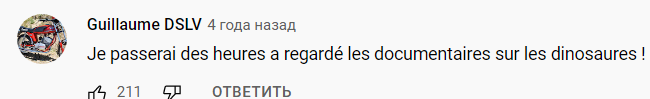Иногда смотрим на Youtube французский канал о природе. И там есть очень хороший раздел про динозавров и прочих доисторических животных. Это короткие фильмы, которые воспроизводят ситуации, реконструированные при раскопках - например, сражение аллозавра и стегозавра, в котором хищник откусил у оппонента кусок щитка (и учёные сверили след от укуса с его челюстью), а стегозавр своим хвостовым шипом повредил аллозавру позвоночник. И объяснение, как последствия этой драки отразились на найденных останках. И вот мне попались на глаза комментарии. Мимоходом заметим, что я знаю французский. Один из пользователей написал, что часами смотрит документальные фильмы о динозаврах. Точно так же можно назвать документальным мультфильм "Холодное сердце", но, как видим, 211 человек с ним согласны. Ладно, спишем на документальный стиль и смотрим дальше. Тираннозавр напал на трицератопса. И здесь коменты не оставили никаких сомнений. Судя по аватарке, вполне взрослый месье пишет: "Респект оператору, ко