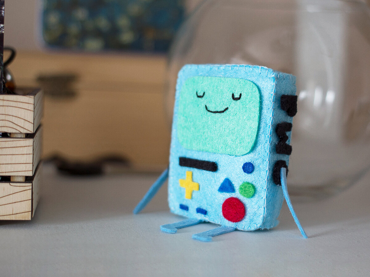 Персонаж из мультсериала "Adventure Time with Finn & Jake". БиМО (англ. BMO) — это игровая видео-приставка Финна и Джейка , а также портативная розетка, плеер, камера, будильник, тостер, фонарик, стробоскоп, программа для редактирования видео, видео-плеер, зарядное устройство, магнитофон и просто друг и сосед. БиМО появляется в опенинге каждого эпизода, когда Финн и Джейк делают брофист (он сидит рядом). БиМО лоялен и доверчив, но он также и очень хороший друг для Финна и Джейка, который всегда им поможет. На передней части БиМО расположены дисковод, несколько кнопок различной формы, два разъема для джойстиков и, конечно, лицо (в данном случае еще и экран). На боковых сторонах расположены логотипы (BMO) и динамики. Логотипы BMO еще служат элементом дизайна: маленькие манипуляторы БиМО начинаются в кружке в букве О. Этого персонажа я сделала сама. Он мягкий и выполнен из фетра. Обычно на других своих изделиях, я пришиваю мелкие детали в ручную, но тут понадобилась помощь клея и пинце