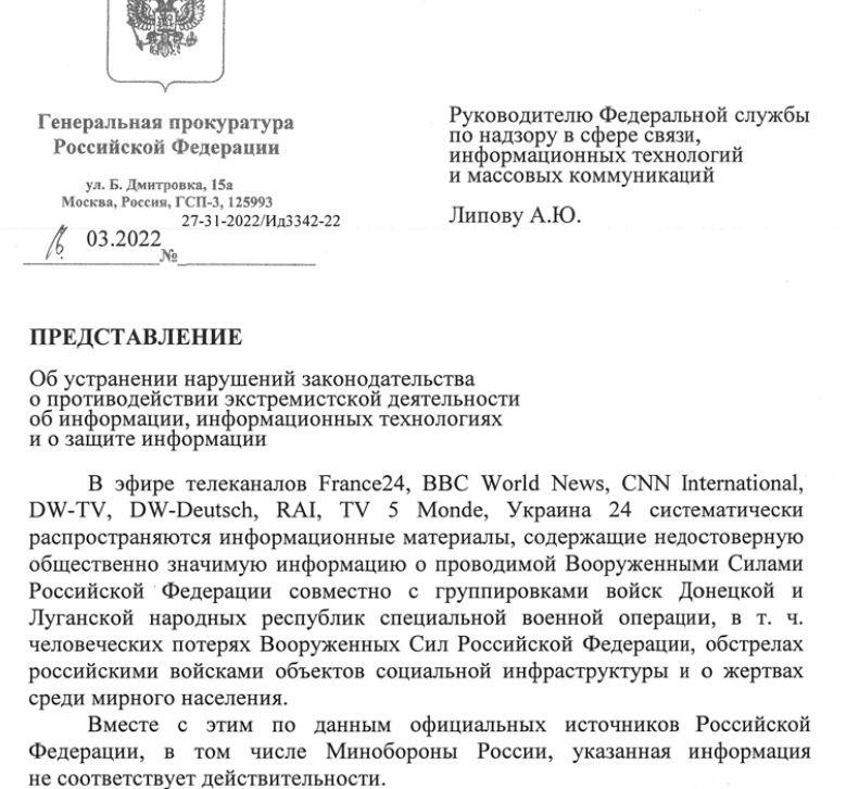 Генеральная прокуратура РФ направила руководителю Роскомнадзора Андрею Липову официальное представление "Об устранении нарушений законодательства о противодействии экстремистской деятельности об информации, информационных технологиях и о защите информации". Копия письма имеется в редакции. В письме, подписанном первым заместителем генерального прокурора А.В.Разинкиным, говорится, что в эфире телеканалов France24, BBC World News, CNN International, DW-TV, DW-Deutsch, RAI, TV5 Monde, Украина 24 "систематически распространяются информационные материалы, содержащие недостоверную общественно значимую информацию о проводимой Вооруженными Силами Российской Федерации совместно с группировками войск Донецкой и Луганской народных республик специальной военной операции, в т.ч. человеческих потерях Вооруженных сил Российской Федерации, обстрелах российскими войсками объектов социальной инфраструктуры и о жертвах среди мирного населения". Напомним, что достоверной информацией российские власти счит