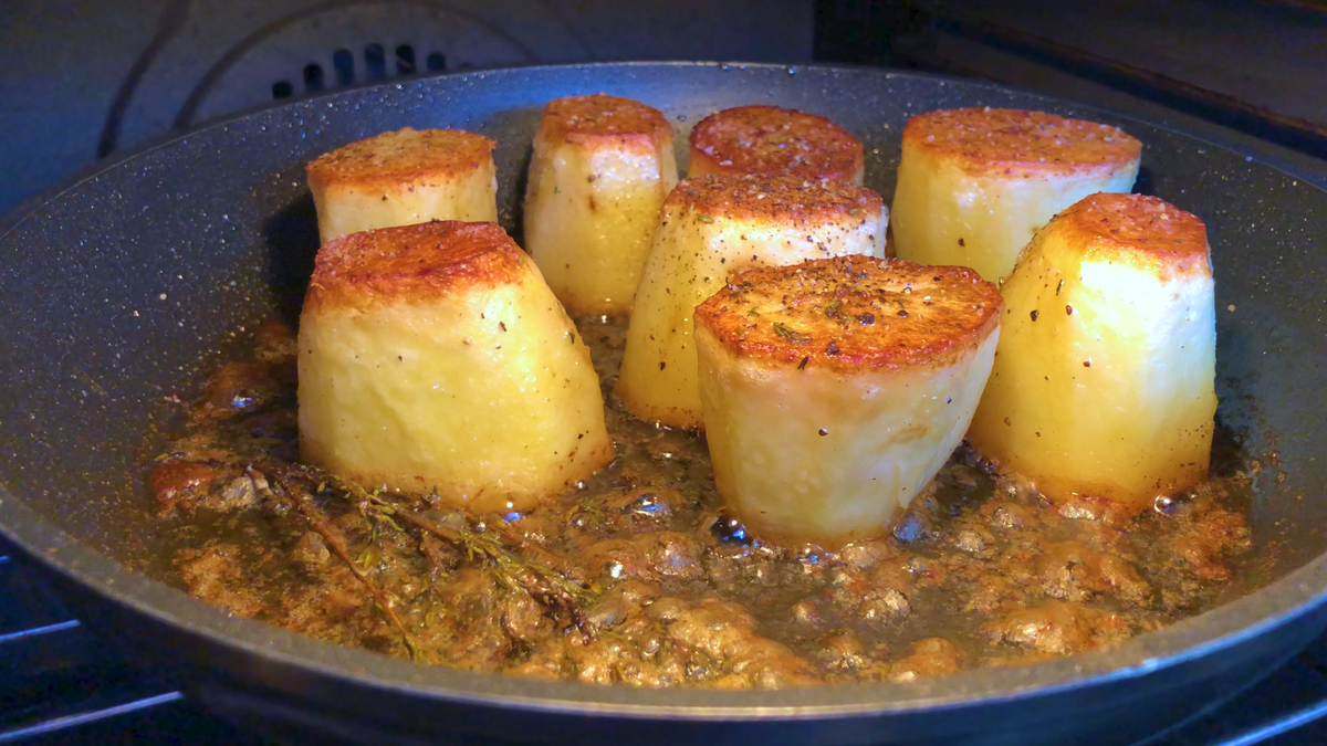Привет Народ! Узнайте, как приготовить маслянистый куриный картофельный гарнир (картофельная помадка). Настоящая магия картофеля с помадкой заключается в хрустящей корочке и нежной и мягкой сердцевиной(то что под корочкой). Рассказываю вкратце: скачала картофельные цилиндры обжариваем до румяной корочке, а затем медленно тушим в масле и курином бульоне. Записка в магазин..." Пошаговый рецепт приготовления: Шаг 1: Разогреваем духовку до 220 градусов. Шаг 2: Отрежьте концы картофеля, т.е. кладем картофель на бок и отрезаем концы так чтоб разрезы(их поверхность) были параллельны. Надеюсь вы поняли). Дальше ставим картофель на край(отрезанный) и очистите картофель сверху донизу острым ножом, чтобы каждая картофелина превратилась в однородный цилиндр. Разрезаем каждый цилиндр пополам поперек, чтобы получилось 8 картофельных цилиндров из 4 картофелин) длиной около 5 сантиметров. Картофель выбираем длинный и ровный, что бы было удобно делать цилиндры. Цилиндры не обязательно делать 5 сантиме