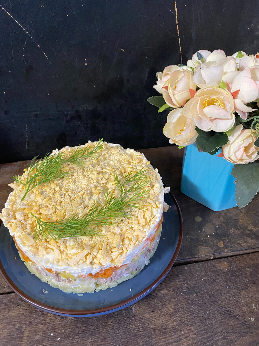 В салатницу выкладывать слоями: 1-й слой: половины тертого картофеля выкладываем на блюдо (Смазать майонезом)
