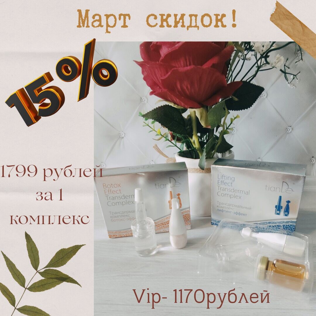 Встречай Весну - с беспрецедентным комплексным омоложением ‼️ В этом, тебе помогут бета - глюканы, глюкозамины, гиалуроновая кислота и гидролизованный коллаген, - компоненты, не нуждающиеся в особом представлении. Они⤵️ ▪️запускают в тканях естественные процессы регенерации; ▪️ стимулируют рост молодых клеток эпидермиса; ▪️ активизируют синтез коллагеновых волокон и эластина; ▪️ активно увлажняют, питают и подтягивают кожу; Девочки эта уникальная комбинация - основа трансдермального комплекса с лифтинг - эффектом. Начни использовать его микрокапсулы и мезококтейль сегодня, и уже через 7 дней, ты заметишь видимый результат:выравнивание несовершенных черт как после курса салонных процедур. Твоя, кожа скажет тебе спасибо, а родные и близкие - комплименты Усилить омолаживающий эффект, тебе поможет - Трансдермальный комплекс ботокс - эффект! Девочки, оба комплекса до 31 Марта ⚡со скидкой 15%⚡Бери скорее, пока действует скидка 😌 💥Купить самостоятельно можно на официальном сайте ti