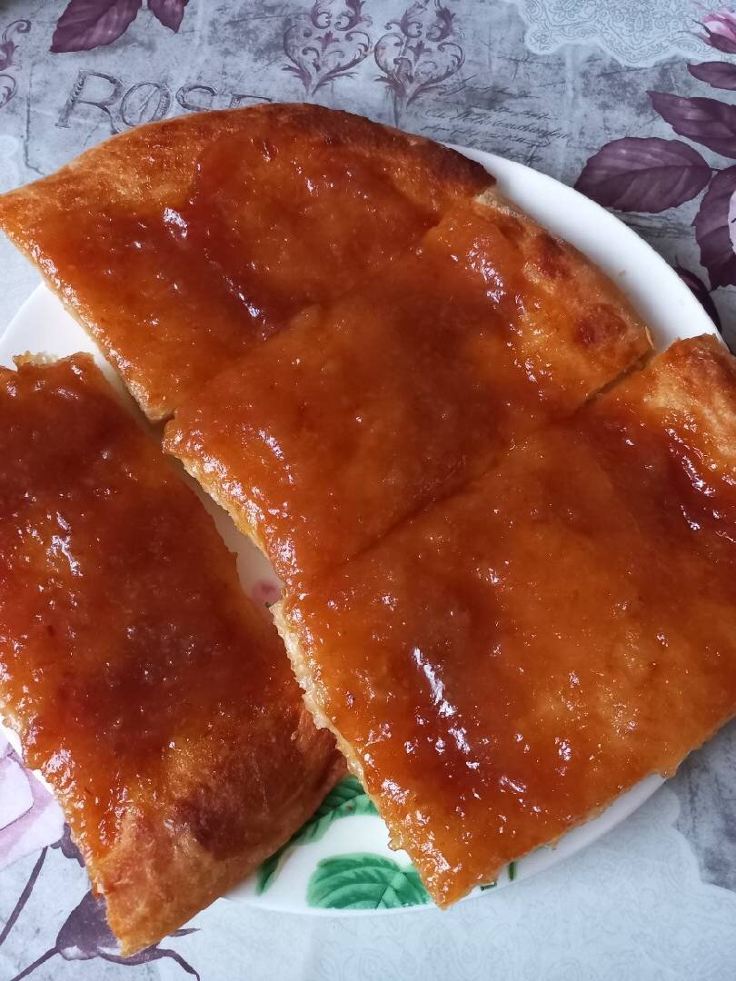 На пирог джем, варенье может быть любым. ☕☕😋😋😋 Ингредиенты: молоко, вода, соль, сахар, сух дрожжи, Масло растит, Мука (как на мягкое тесто, я на глаз), Повидло у меня яблочное Способ приготовления: Замешиваем мягкое тесто. Даём подойти 1-2 раза. Делим на 2 части и раскатываем, тонким слоем, выкладываем на листик. Сверху слегка смазываем повидлом даём подняться и выпекаем в духовке. При t 200 град. До зарумянивая. Достаём из духовки и ещё промазываем повидлом, сколько? На ваше усмотрение.. Приятного чаепития.