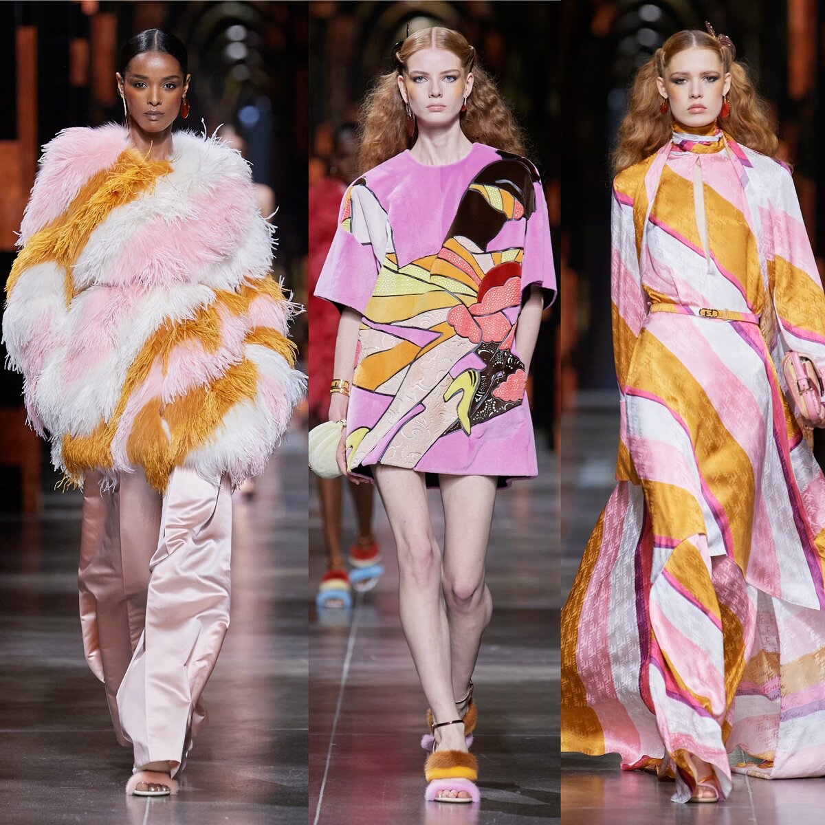 Коллекция Fendi SS’22 RTW - это сама женственность и элегантность во плоти! И да - конечно же, роскошь! В семидесятые гламур был возведён в культ: яркие цвета, богемные силуэты, оптимизм и динамика. Поэтому вовсе немудрено, что Ким Джонс обратился именно к этой эпохе, создавая свою коллекцию. Особенно сейчас, когда нам так необходим оптимистичный взгляд на будущее. Струящийся крой, пышные шубки из перьев, меховые аксессуары, яркие платья в пол, атласные костюмы, местами напоминающие фордовские… Всё это бесконечно притягивает взгляд! Как всегда, женственно и в высшей степени роскошно. Принты добавляют динамики. Но давайте разберёмся, откуда же они взялись? Главным вдохновителем этой коллекции стал иллюстратор 70-х Антонио Лопес. Его обожали Лагерфельд, главные редакторы глянцевых фэшн изданий и вообще весь модный мир, а Энди Уорхол и вовсе по недоброму косился, признавая превосходство соперника. «Он был очень влиятельной фигурой в мире моды для многих людей, но о нем не так мно