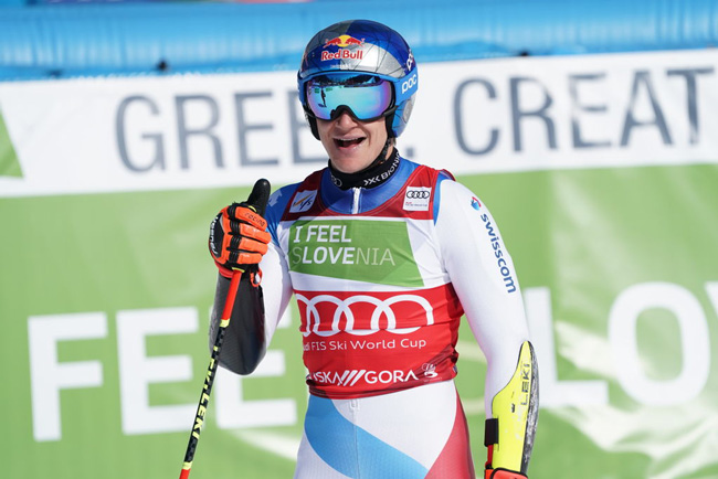 Жюстин Мурисье (Швейцария) наверху проигрывает 23 сотых, но дальше, там где Марко первый раз ошибся, идет уже по его графику. Снова проигрывает, теперь уже полсекунды, и на финише он уступает своему товарищу 50 сотых.
