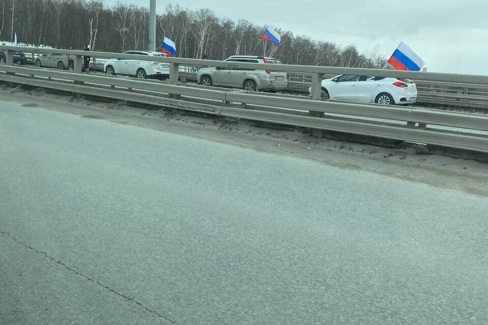 Колонна автомобилей с флагами России и символикой «Z» выстроилась на Бугринском мосту в Новосибирске