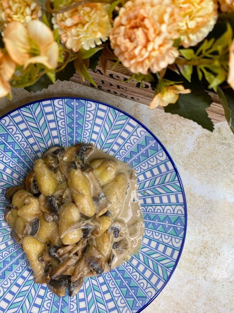 Ингредиенты: Ньокки, Картофель, Соль, Мука, Соус грибной, Шампиньоны, Лук, Бульонный кубик грибной, Сливки 10 %, Соль Способ приготовления: Картофель отварить мундире или запечь. Ещё горячий очистить и поменять. Лучше это делать даже тёркой. Чтобы не получилось комочков. Добавить чайную ложку соли и муку. Замешать тесто. Далее делим его на четыре части и каждую часть раскатываю в колбаску толщиной 1 см. Теперь нарезаем по 2 см. И немного прикатываем. Для приема пищи я приготовила половину. Другую половину я выложила на застеленную пакетом доску и убрала в морозилку. Для соуса лук мелко нарезать. Грибы нарезать не очень мелко. Обжарить лук на растительном масле и добавить шампиньоны. Все обжариваем до приятного аромата и зажаристости. Зачем добавить подогретые сливки или немного остудить затем добавить сливки. Главное, чтобы не было сильного перепада температуры. Отдельно я залила небольшим количеством кипятка кубик и добавила растворённый кубик в грибы. Соль тут добавлять по вкусу, я н