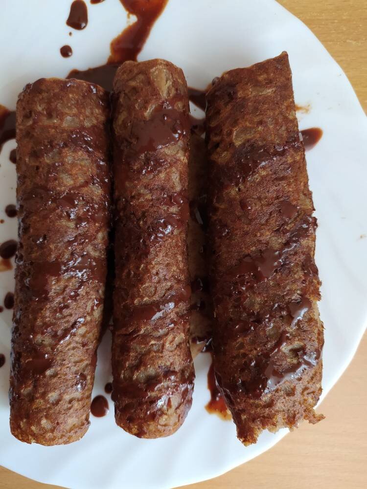 #веган #меню #идея #блины #безглютена. Высокая цена на бананы - не повод от них отказаться😱😂😁. Очень вкусные блинчики с начинкой из свежего банана не оставят Вас равнодушными 😊🥞. Ингредиенты: Для теста:, ст.л (40 г) рисовая мука, ст.л (15 г) кукурузная мука, ст.л нутовая мука, ч.л (7 г) семена льна (перемолоть в кофемолке в муку), ч.л (15 г) киноа (перемолоть в кофемолке в муку) по желанию, ч.л (4 г) кукурузный крахмал, (ингредиенты выше👆можно заменить любой мукой с глютеном), ч.л (10 г) кэроб (или какао-порошок), ст (1 ст = 250 мл) вода (примерно), банан (у меня это 75 г), ст.л растительное масло, соли, ч.л сода, Сок лимона или яблочный уксус погасить соду, Для подачи и для соуса:, банан (маленький), горький шоколад (растопить), растительное молоко/растительные сливки/кипячёная вода, ст.л жидкий подсластитель (у меня финиковый сироп), ч.л кокосовое масло Способ приготовления: В миску просеять все виды муки, кэроб, кукурузный крахмал, перемолотые семена льна и киноа. Муку выбирай