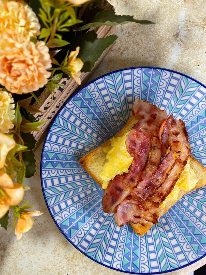 Ингредиенты: Хлеб для тостов или багет, Яйца, сметаны 20 %, Соль , Хороший кусочек сливочного масла, копчёный бекон Способ приготовления: Хлеб обжарить, я это сделала в тостере. Яйца взбить с солью. В сковороде растопить сливочное масло. На самом маленьком огне поставить сковороду. Вылить яйца и сразу же потихонечку начать мешать. Наша задача равномерно жарить яйца, чтобы они сохранили кремовую текстуру. То есть они ещё ели схватились а мы уже мешаем. Когда масса более-менее сформируется в комок. В это время добавляем две чайной ложки сметаны. И снова продолжаем мешать. Готовим для тех пор пока масса не превратится в кремообразную консистенции, но при этом она будет держать форму. То есть если вы выложите это на хлебушек оно не растечется, но при этом это не будет какой-то сухой комок. Можно посмотреть консистенцию на видео. Следом обжарить бекон. На поджаренный хлеб выложить яичный скрембл, а затем выложить бекон.