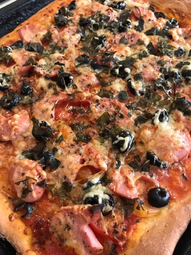 #ужин Тесто быстрое, начинку можно брать любую на свой вкус. Ингредиенты: пшеничной муки (260 гр+_ стакан), сухих дрожжей, мелкой соли, сахара, оливкового масла (я взяла сливочный маргарин), тёплой воды, начинка:, сосиски, кетчуп, помидора, оливки, каперсы, базилик, сыр твёрдый, болгарский перец Способ приготовления: К просеянной муке добавить сухие дрожжи, соль, сахар. Влить тёплую воду и растительное масло. Замешиваем тесто, постепенно добавляя муку, пока не замеситься мягкое тесто. Убираем тесто для подъёма на 40-45 минут. Затем тесто раскатать, протыкать вилкой и смазать кетчупом. Затем разложить начинку и посыпать сыром, базиликом и петрушкой. Выпекать при 190-200 градусах 18-20 минут.