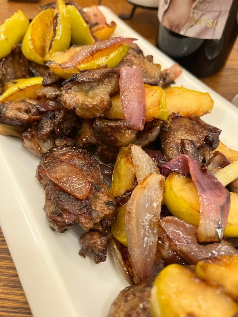 Очень простой, быстрый в приготовлении салат, а сочетание печени и яблок - не только вкусно, но и полезно 👌🏻 Ингредиенты: печени куриной, средних яблока зелёных кислых, средние луковицы (красный или ялтинский), Сливочное масло, Коричневый сахар, Мука, Мускатный орех, Коньяк Способ приготовления: Печень очистить и обсушить. В муку добавить мускатный орех, обвалять печень и обжарить на растительном масле до корочки, но чтоб внутри печень осталась розовой. В конце добавить немного коньяка, выкл плиту, посолить печень. Можно параллельно или сначала начинать с обжарки лука. Лук разрезать на крупные кусочки, и обжарить до того состояния, которое любите вы. Можно аль Денте, можно до мягкости или до полной готовности. Яблоки разрезать тоже крупно, на 8-10 частей. На сливочном масле обжарить и посыпаем сразу коричневым сахаром. Получатся карамелизированные яблочки. Соединить все ингредиенты. Можно прогреть на сковородке, если сильно остыли.