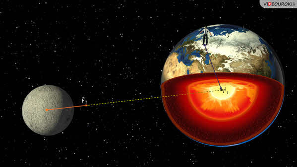 Ещё одним примером проявления возмущающей силы являются приливы и отливы. Эти два явления, известные человечеству с незапамятных времён, получили объяснения лишь на основе закона всемирного тяготения. Чтобы понять, почему наблюдаются приливы и отливы, рассмотрим простую ситуацию: есть Земля, Луна и три точки, две — находятся на поверхности Земли, а третья — в её центре. Луна под действием силы своего притяжения будет сообщать этим точкам ускорение. Но так как они расположены на разном расстоянии от неё, то приобретаемые ими ускорения будут различны.