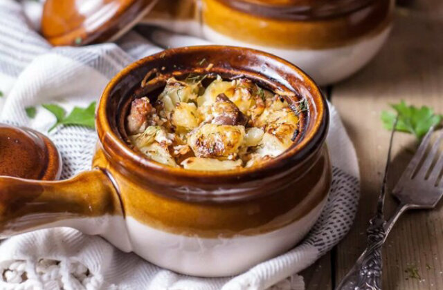 Ингредиенты: Куриное филе — 400 гр. Картофель — 250 гр. Лесные грибы (можно любые другие0 — 250 гр. Сыр — 60 гр. Сметана — 40 гр. Репчатый лук — пару средних луковиц Чеснок — пару долек мука — 80 гр. Вода — 150 мл. Соль Специи Перец Приготовление: Куриное филе промоем под холодной водой и выложим на бумажные салфетки. Как только мясо обсохнет, нарежем его небольшими кусочками. К муке добавим соль, специи, перец, перемешаем и обваляв мясо, обжарим со всех сторон на масле. Лук нарежем мелко, а грибы кусочками. Сначала обжарим лук, затем добавим к грибы и обжарим еще раз все. Очищенный картофель нарежем небольшими кубиками и выложим на дно горшочков. Сыр натрем на терке, добавим к нему сметану, специи, выдавленный чеснок, воду и нарубленную зелень и перемешаем хорошенько. Поверх картофеля выложим в горшочки мясо, после грибы и зальем приготовленным соусом. Горшочки поместим в разогретый духовой шкаф. При 230 градусах наше блюдо будет готово приблизительно через 40 минут. Подадим наше блю