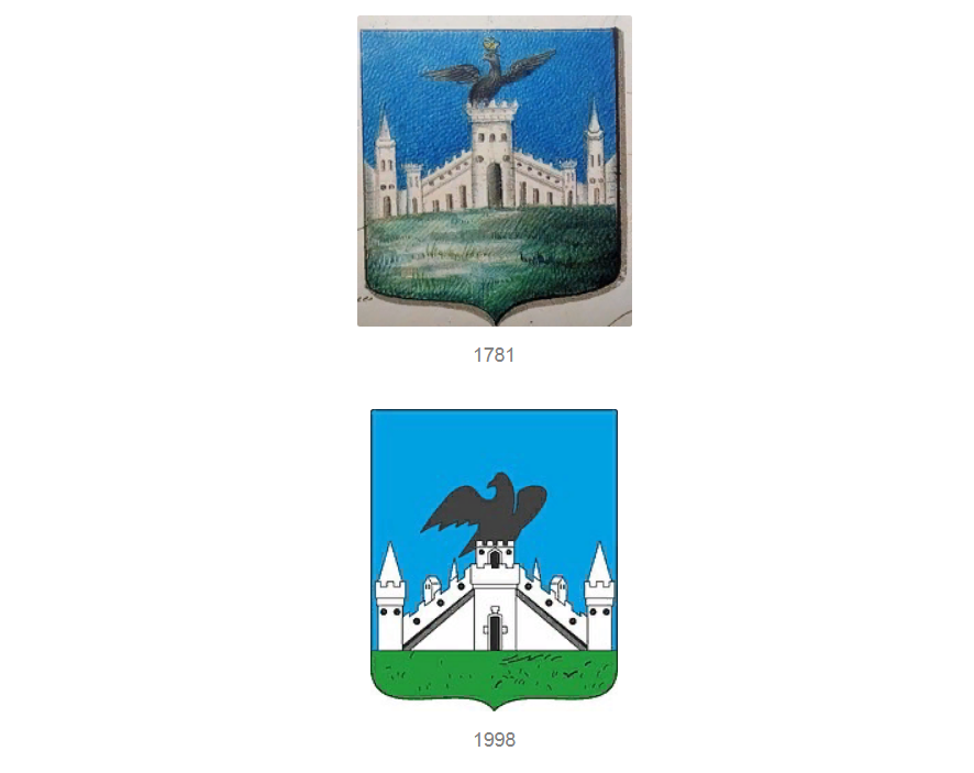 В синем поле, белый город, на воротах чёрный одноглавый орёл с золотой короной на голове. В 1966 году на вершине обелиска в честь 400-летия города Орла был изображён новый советский вариант герба города, который в дальнейшем и стал его неофициальным гербом. В 2014 году рассматривалось предложение улучшить герб города, дополнив его дополнительными элементами и цветами. Ливны (с 1781 и с 2005)