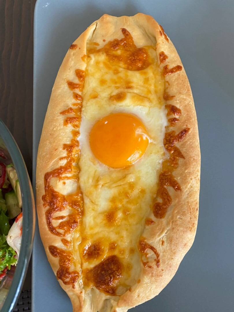 Ингредиенты: муки, молока, Дрожжи сухие , Растительное масло , соли и сахара, Сыр сулугуни , желтка, Слив. масло примерно Способ приготовления: В миску просеиваем муку, добавляем соль, сахар и дрожжи. Разогреваю молоко и добавляем в муку. Добавляем в почти готовое тесто растительное масло и перемешиваем масло. Формируем «лодочки» и посыпаем сыром. Растапливаем слив. масло в микроволновке или на водянкой бане и смазываем им лодочки. Духовку разогреваем до 180 г и ставим в неё лодочки примерно на 15-20 мин (до появления золотой корочки). Достаем из духовки делаем углубление и добавляем сверху желток. Снова ставим в духовку примерно на 1-2 мин чтобы желток не был сырым.