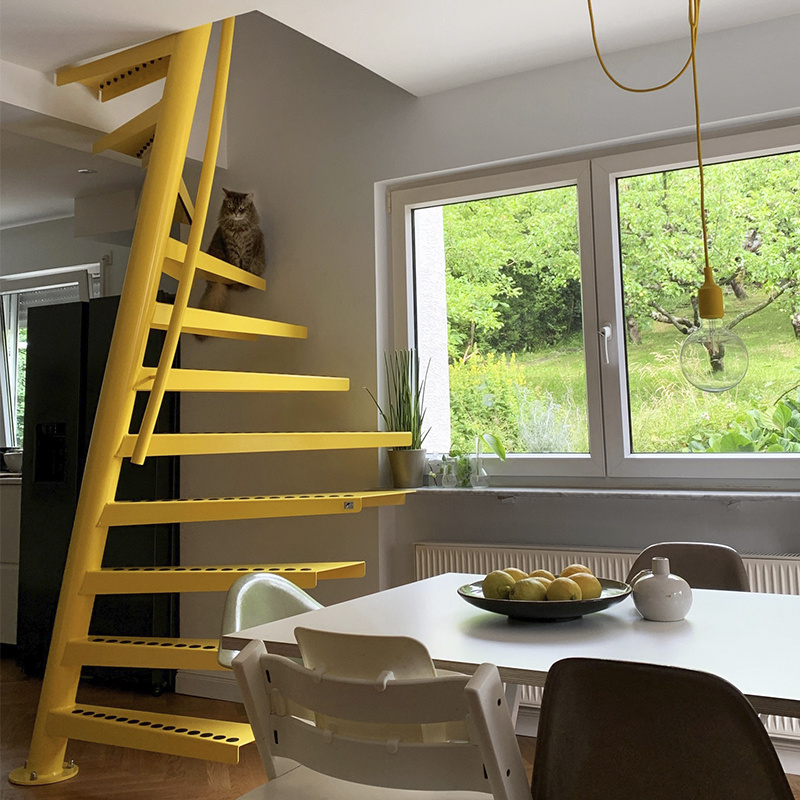 Нам сделали заказ на изготовление лестницы винтовой металлической «МЗЗ» для установки в двухуровневых апартаментах на юге Москвы. Однако при замере выяснилось, что проем для этой лестницы очень небольшой: 118х118см. Причем проем нельзя было никак расширить по строительным нормам дома. Получалось, что на ширину ступени оставалось 57см, что совсем мало для любой часто используемой лестницы. К тому же заказчиками были довольно крупные люди, которым пришлось бы передвигаться по обычной винтовой конструкции исключительно боком. Поэтому был предложен вариант с наклонной основой, примерно как у нашей компактной лестницы «Косая стойка». Такой вариант конструкции позволял сделать ступени практически на всю ширину проема — 120см. Плюс заход и выход с лестницы получался в оптимальных местах на обоих этажах квартиры. Ограждения на первом этаже сделали сплошные потолочного крепления. Поручень винтовой из трубы расположили на опоре. Заказчики попросили покрасить всю конструкцию в желтый цвет. Это ещ