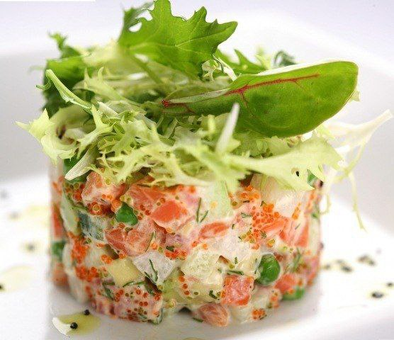 Ингредиенты: Картофель 2 шт. Морковь 1-2 шт. Огурцы 1 шт. Рыба (красная) 300 гр. Зеленый горошек (консервированный) 150 гр. Красная икра 30 гр. Яйцо куриное 3 шт. Сметана Свежая зелень Самое популярное в России новогоднее блюдо можно видоизменить, чтобы получить что-то новое и неповторимое. Например, интересный вариант представляет собой рецепт оливье с соленой красной рыбой. Приготовление Картофель отваривают в мундире, затем снимают с клубней кожуру и нарезают мелкими кубиками. Так же поступают и с морковью, которую готовят в слегка подсоленной воде. Слабосоленой семгой в этом случае заменяют все мясные компоненты традиционной рецептуры – ее режут кубиками среднего размера. Измельчают сваренные вкрутую яйца. С консервированного зеленого горошка сливают излишки жидкости. Огурцы режут тонкими ломтиками. Подготовленные ингредиенты соединяют в салатнице, вносят необходимые приправы, заправляют майонезом, а сверху украшают веточками зелени. #еда #просто кухня #кулинария #ед