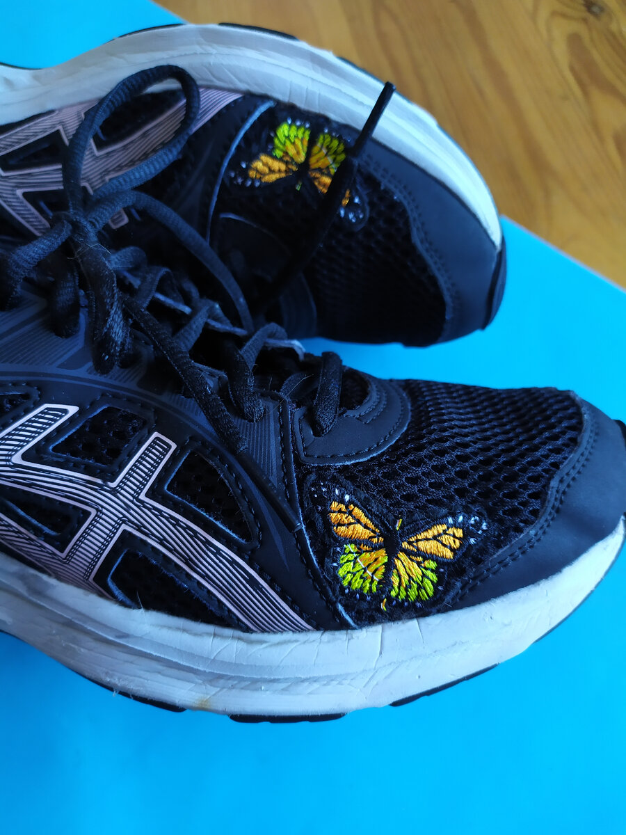 Есть у меня любимые кроссовки ASICS, бего-, вело- и прогулкопригодные. Два года всё теплое время в них, очень удобные, ноги не устают. Естественно, ничего не вечно. Кроссы тем более! Потрепались мои беговые друзья, задник обтёрся, частично высыпался поролон, в зоне пальцев протерлась сетка там, где мизинец. Выкидывать жалко, искать нормальную обувную мастерскую времени нет. И потом, што я, мастер-фломастер, сама не справлюсь что ли! В общем, Ютуб и Пикабу были мне в помощь. Всякий материалы типа иголок, ниток, напёрстка (какая полезная вещь!!) и ножниц был. Докупила три вещи: - кусочек тонкой мягкой кожи (тёмно-коричневый, ибо подходящего чёрного не нашлось), - клей для кожи (в ближайшем Леруа), - нашивки (для красоты, о них дальше). Порядок был такой: 1. Сначала я их постирала и хорошо просушила. 2. Затем убрала стельки и шнурки, обрезала скатавшуюся ткань, остатки поролона и прочие нитки, чтобы максимально очистить рабочие поверхности. 3. Затем с помощью бумаги сделала шаблон заплатк