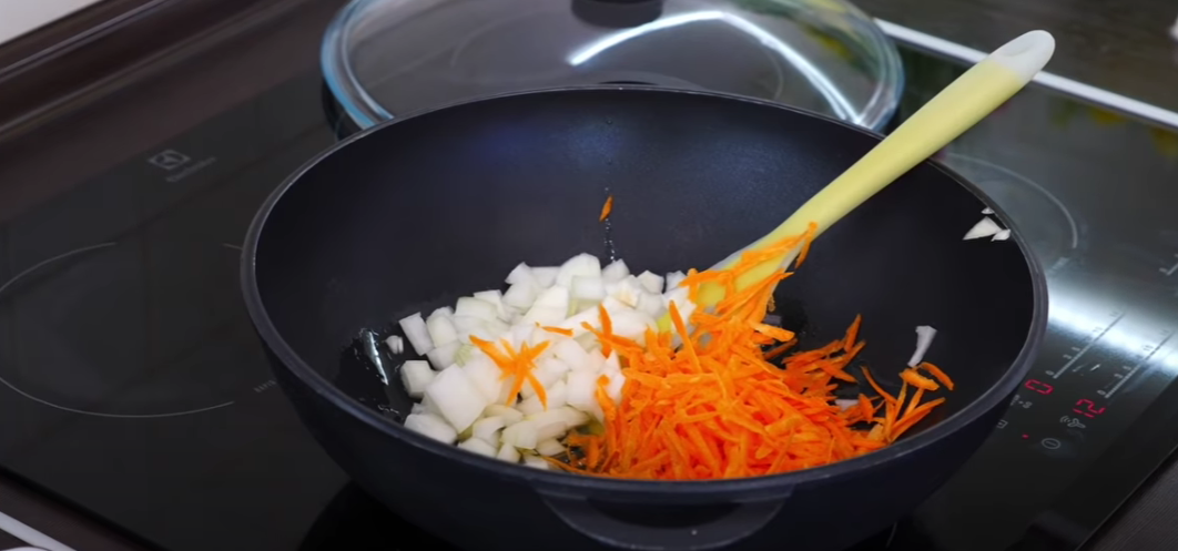 Для приготовления плова нам понадобится: Морковь – 1-2 штуки в зависимости от размера. Рис - 500 грамм Вода 500 – 600 мл Соль Растительное масло Перед тем, как начать нарезать основные ингредиенты, на плиту ставим сковородку, желательно с высокими бортиками, казан или утятницу и разогреваем ее вместе с растительным маслом. Начнем приготовление с того, что нарежем лук. Можно нарезать, как крупно, так и мелко, в зависимости от того, любите ли вы его добавлять в блюдо или нет. Затем можно нарезать морковь, но лучше всего натереть ее на крупной терке. Теперь лук и морковь высыпаем на разогретую сковородку. Пассируем до золотистого цвета. Теперь сюда засыпается рис, который желательно промыть в проточной воде. Сразу же можно добавить соль и любимые специи, как обычно добавляются при приготовлении плова. Все тщательно перемешиваем. Убавляем огонь и накрываем крышкой на десять – пятнадцать минут. После этого добавляем воду, вновь накрываем крышку и на небольшом огне готовим пятнадцать – двад