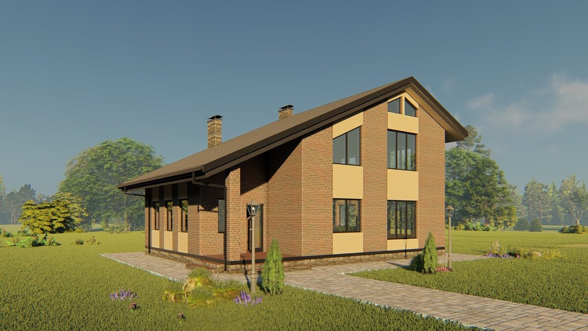 Наружная отделка – облицовочный кирпич. Строительство дома начинается с проекта. Только имея полный и подробный проект будущего дома можно быстро и грамотно построить его без ошибок, накладок и переделок. Проект поможет наиболее точно представить внешний вид дома, планировочные решения, расход требуемых материалов и конструктивные решения фундаментов, стен, перекрытий и крыши. Проект дома разработан специалистами в области проектирования и строительства загородных домов, коттеджей с учетом ГОСТ и СНиП. Проект состоит из разделов: АР (архитектурные решения), КР (конструктивные решения) и 3D-визуализации. Выполнен на бумажном альбоме формата А-3 в количестве 20-30 рабоч