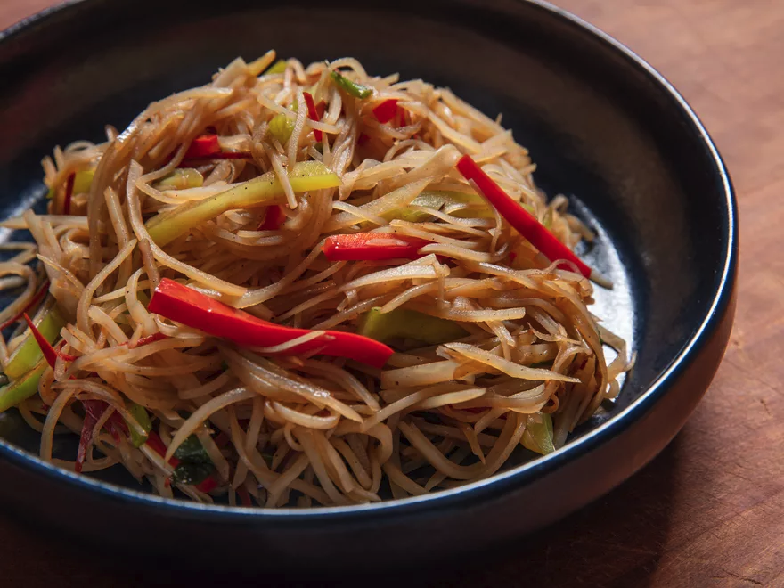 В китайском языке есть такое понятие как “кай вэй”, это нельзя перевести дословно, но смысл в том, чтобы "подготовить желудок к приёму пищи, открыть его для небесных явств" (ага, вот так образно и сложно. Блюда в стиле кай вэй, действительно, ставятся на стол первыми, но их едят не так, как мы салат, скажем, а и кладут палочками в суп, выкладывают на рис, возвращаются к ним снова и снова посреди трапезы. Вот и этот жареный картофель по-сычуаньски с присущей ему свежестью, кислинкой, хрустящей нежной текстурой и пощипыванием языка от перечного "тепла" - чудесное тому подтверждение. А всё, что нам нужно - тёрка для корейской морковки (или умение виртуозно нарезать картошку тончайшей соломкой), да немного несложных компонентов. А, ну ещё широкая сковорода или (идеально) вок. Тренируемся на малом количестве (в этом блюде важно не переборщить с объемом, даже если готовим много, готовим отдельными порциями) 1 большая или 2 средние картофелины (около 300 г), нарезанные соломками-спичками, и
