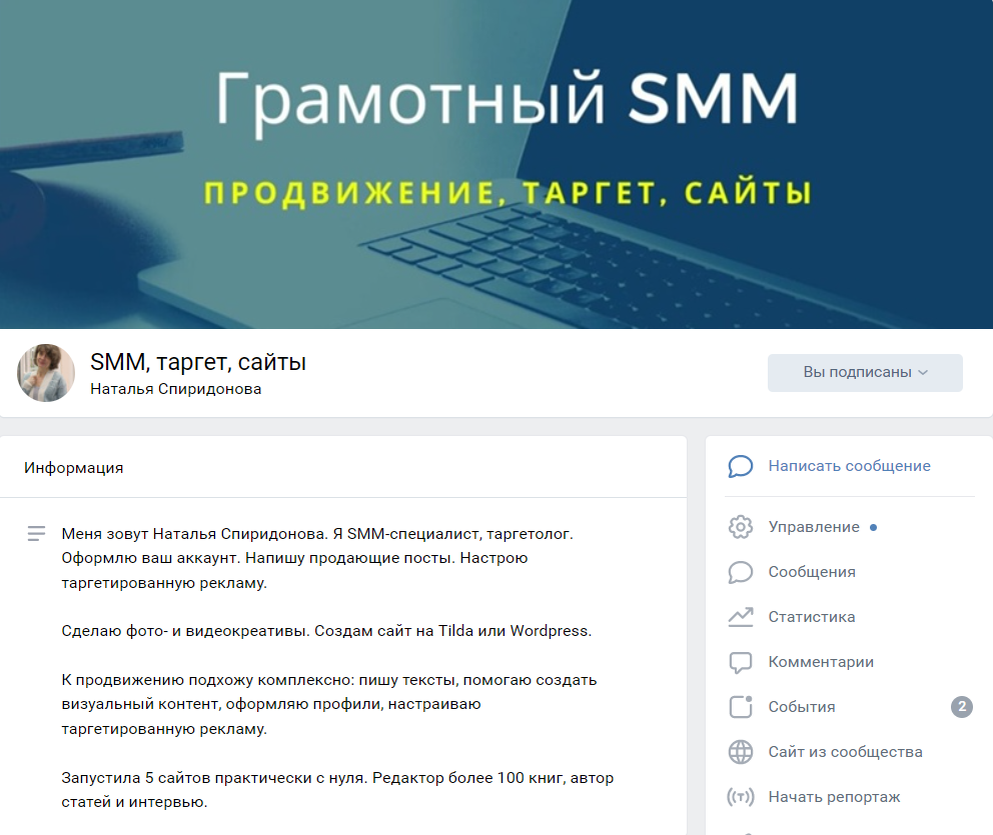 Личная страница ВКонтакте – это визитная карточка. К ней мы все привязываем, создаем рекламный кабинет. Это наш центр управления, скажем так. Сообщества бывают разные, и тут нужно выбрать для себя правильный тип. Но если вы при создании ошиблись, это не страшно, всегда можно поменять (делается это 1 раз в месяц). Если вам, как и мне, нужен блог, то делайте публичную страницу. В сообществе есть возможность настроить обложку. Причем вы можете сделать как десктопную, так и мобильную версию (для нее есть возможность загрузить короткие видео). Еще один важный момент: название сообщества хорошо индексируется поисковиками. Что лучше использовать для продвижения – личную страницу или сообщество? Сообщество. Почему? Все очень просто – все дополнительные элементы продвижения, например, виджеты, возможность добавить рассылки, словом – все техническое оснащение для продвижения привязано именно к сообществу (а не к личной странице). Поэтому рекомендую к личной странице привязать еще и сообщество. Е