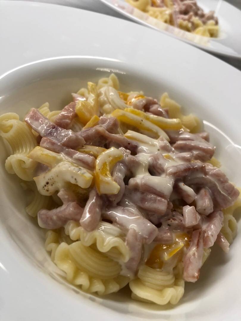 #меню #ужин #паста #итальянскаякухня Ингредиенты: Чеснок, Перец болгарский, Ветчина, Сыр плавленый, Сметана, Итальянские травы, Оливковое масло, Макароны гребешки Способ приготовления: Перец нарезаем брусочками. Чеснок нарезаем пополам. Ветчину нарезаем брусочками. Оливковое масло разогреваем в сковороде, обжариваем чеснок 1-2 минуты, убираем чеснок из сковороды, обжариваем перец и ветчину. Добавляем сыр и сметану. Тушим 2-4 минуты, сыр за это время расплавится. Посыпаем итальянскими травами. Отвариваем макароны. Подаём порционно, макароны заливаем соусом. Приятного аппетита.)