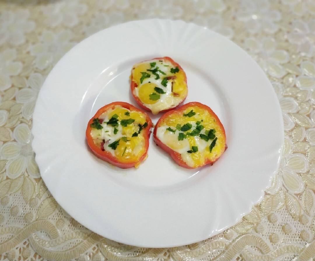 #меню Ингредиенты: Сладкий перец (большой, красный) , Перепелиные яйца , Колбаса, Сыр, Растительное масло , Соль, молотый перец , Свежая зелень Способ приготовления: Большой сладкий перец, лучше красного цвета, вымыть, вытереть досуха салфеткой и порезать кольцами толщиной 5-7 мм. Удалить из колец перца семена и белые перемычки. Колбасу и сыр порезать на мелкие кубики. Разогреть на сковороде немного растительного масла и слегка поджарить колбасу. Поджаренную колбаску лопаткой собрать в кучку, в центре сковороды положить кольца из перца. Дно колец заполнить колбаской, на колбасу положить сыр. Сверху кладём по два перепелиных яйца, посолить, поперчить по вкусу. Уменьшить нагрев до очень маленького и готовить под крышкой до тех пор, пока белок и желток хорошо схватятся. Переложить яичницу в тарелку. Готовую яичницу в перце посыпать рубленой зеленью. Приятного аппетита!