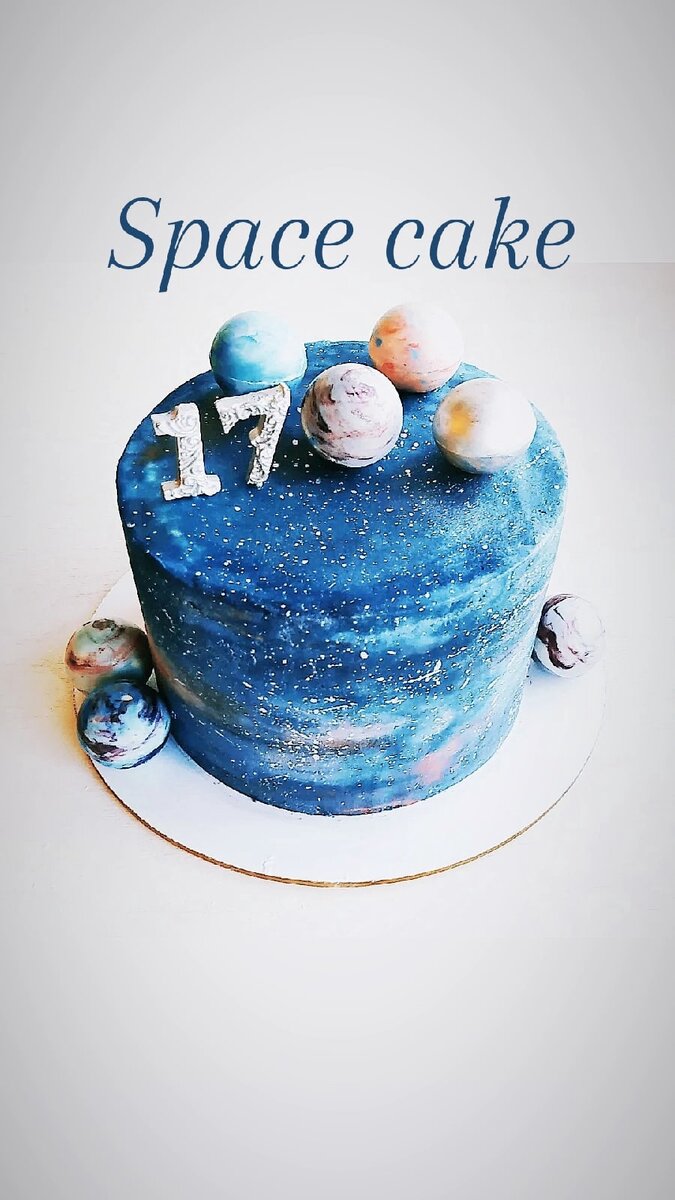 Торт в стиле "Космос" Глядя на этот тортик, так и хочется сказать «Просто космос»! Благодаря своему необычному цвету торт действительно ассоциируется с космическим пространством. Подобный дизайн получается очень реалистичным. И самое главное такой дизайн совсем не сложный и каждый может сделать его на своей кухне. Для того чтобы сделать такой дизайн, вначале нужно произвести черновое выравнивание на торте, который заранее был собран в кольце. Сделать это можно при помощи кондитерского мешка или палеты(лопатки), нанести крем на торт, а затем выровнять кондитерским шпателем, далее убрать торт в холодильник что бы крем схватился. Желательно использовать поворотный столик. Черновое выравнивание обязательный процесс в покрытие торта кремом. Далее крем делим на несколько частей. Большую часть крема окрасить в основной цвет синий, или синий с разными оттенками на ваш выбор, главное чтоб цвет крема был более реалистичным. Остальные части окрасить в разные цвета