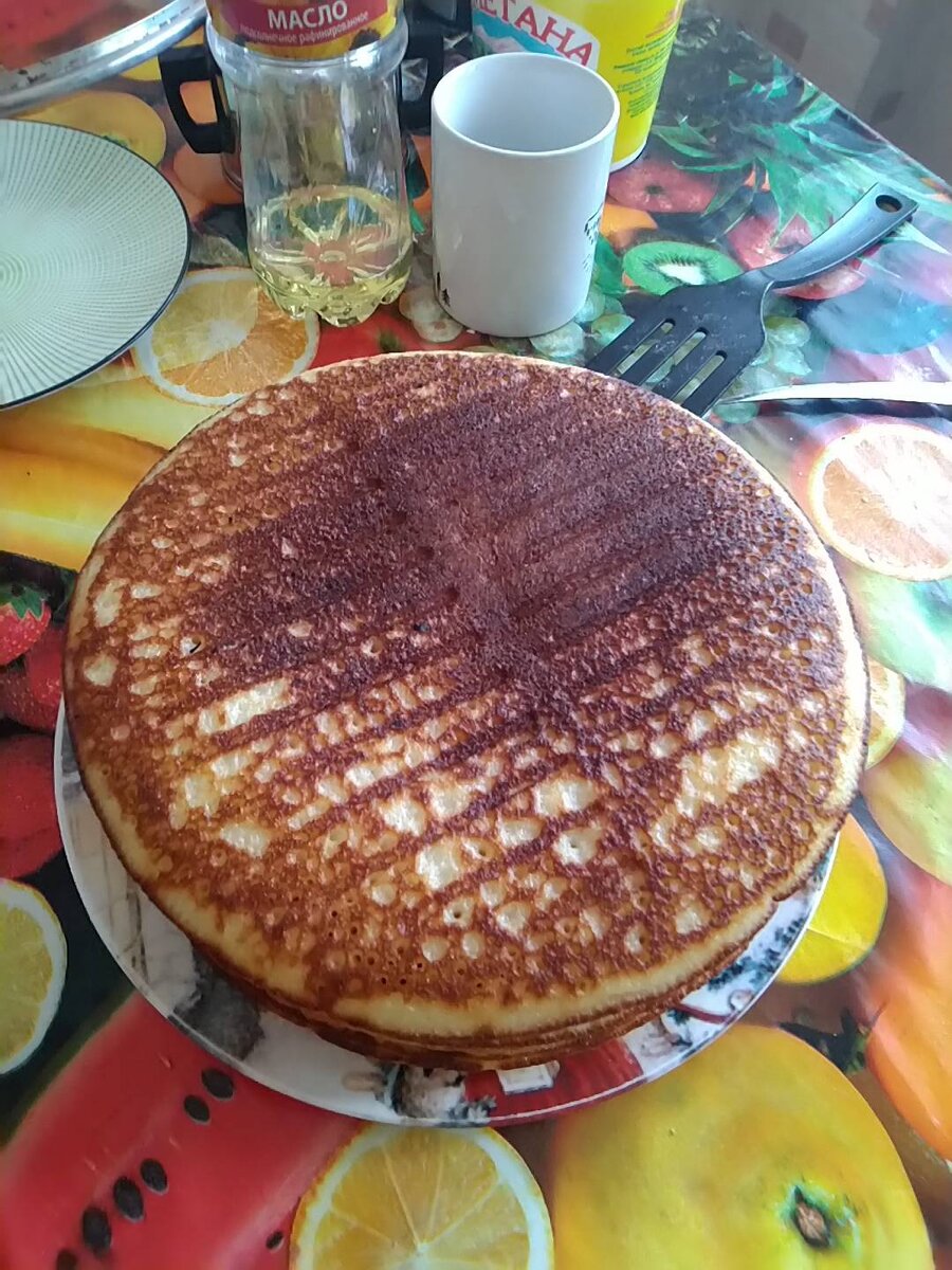 Не быстро, но вкусно😉 Также можно использовать их как торт, крем любой. #блины #меню #вкусно Ингредиенты: Манка, гр.дрожжей, соли, сахара, горячей воды, кипящего молока, яйца, растительного масла Способ приготовления: Смешать все сухие ингредиенты, перемешать. Влить горячую воду, перемешать, накрыть полотенцем и оставить на час, чтоб тесто подошло. По истечении часа тесто хорошо подошло, кипятим молоко и выливаем его в тесто, все тщательно перемешиваем, добавляем 4 яйца, перемешать. Даём тесту постоять 15 минут. Далее, добавить 4 ст. л. раст. масла. Перемешать. Печём на разогретой сковороде с небольшим количеством масла. В сковороду влить 2-3 половника теста (все зависит от диаметра сковороды). Блины должны быть толстые. Вот так. У меня получилось 7 штук, диаметр моей сковороды 10 см. Блины получаются нежные, пористые внутри, очень вкусные. Или.. в виде торта🤗😉👍 Крем: сметана со сгущёнными сливками