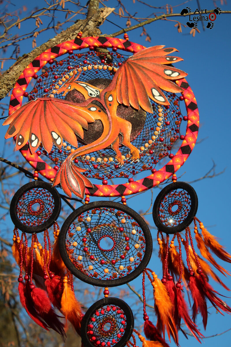 Первый пост ачну с самой запоминающейся работы прошлого года. Большой ловец снов "Огненный космический дракон". Длина ловца снов без учета подвесной веревочки составляет 90 сантиметров. Диаметр колец 38, 17 и 10 сантиметров. Основы сделаны из дерева (березовая фанера), обмотаны хлопковой пряжей. Плетение из хлопка, в плетении бусины из стекла, тонированного агата "Вены дракона" и стеклянный бисер. Перья - петух тонированы). Дракон из ткани, расписан вручную. Крылья и хвост составные. Дракон склеивался из более чем 20 частей. Не знаю, видно на фото это или нет - но в живую крылья более объёмные, чем у прошлых драконов. В этом году таких работ буду делать больше. Правда, и по стоимости они будут выше ;) А теперь много фотографий: