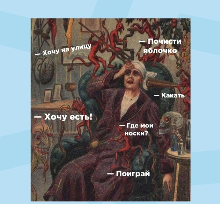 У меня четверо детей: трое своих и четвёртого свекруха отдала на перевоспитание. Так вот, пошла к доктору из-за проблем с памятью и трудностей с концентрацией внимания. Доктор рекомендовал спать 8 часов в день. У меня боль в спине. Невролог говорит,что я должна заниматься в бассейне и пилатесом 2-3 раза в неделю. Учитель моего старшего сына, говорит,что ребёнок должен быть под контроле,когда делает уроки. Самый младший не говорит,но ему нужно готовить каждый день свежую еду с соблюдением набора гиппоаллергенных продуктов. Мой муж и старшие дети ,говорят , что не готовы есть пюрешки и кашки, поэтому им приходится готовить,что-то другое. Эксперты в области родительства, образования и психологии, говорят, что для гармоничного развития ребёнка, я должна заниматься с ним 30 минут в день. Это значит 30 минут на старшего,30 минут на среднего и 30 минут на младшего. Педиатр говорит, чтобы я гуляла с детьми в парке не менее часа,чтобы они получили достаточно кислорода для головного моз