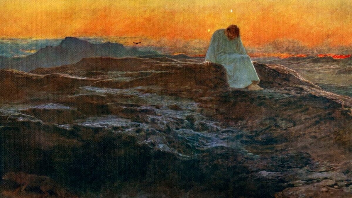 Солнце на западе заходит. Он берет пустую котомку и, сопровождаемый ангелами, которые, зависая у Него над головой, издают мягкое свечение, в то время как стремительно опускается ночь, направляется к востоку или, точнее, к северо-востоку. К Нему возвращаются Его обычный внешний вид и уверенный шаг. Только более аскетичное выражение на худом бледном лице, да неземная радость в глазах остаются напоминанием о долгом посте.