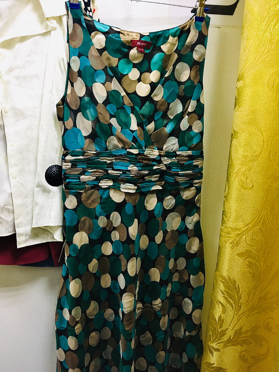 Снега навалило, весна не торопится, наверно, плохо зиму проводили. В надежде на то, что будет лето, ищу стильное платье в секонде, выбрала несколько экземпляров на примерку. Шёлковое платье английского бренда Monsoon за 1000р, на подкладке из полиэстера, без рукавов, с глубоким V-вырезом и драпировкой на поясе. Шикарная расцветка в бирюзово-бело-оливковый крупный горох. Идеальное состояние. Примерила, нет, нельзя мне без рукавов, да и вырез слишком глубокий, если к нему жакет набросить, другое дело. Хлопковое двубортное платье бежевого цвета любимого фасона за 500р. Нравится как село, но у меня есть похожее, тоже из секонда. Нашла хлопковое платье приталенного силуэта с юбкой в складку, цена 1000р, совсем новое Люблю фасоны, подчеркивающие фигуру ещё с юности, но это платье явно мало. Конечно, до модели не дотягиваю, как не утягивайся. 😁 Нашла подобное платье на сайте этого бренда Платье в горох на запАх из вискозы за 1000р, на коричневом поле белый горох. Рукав 3/4, село хорошо,