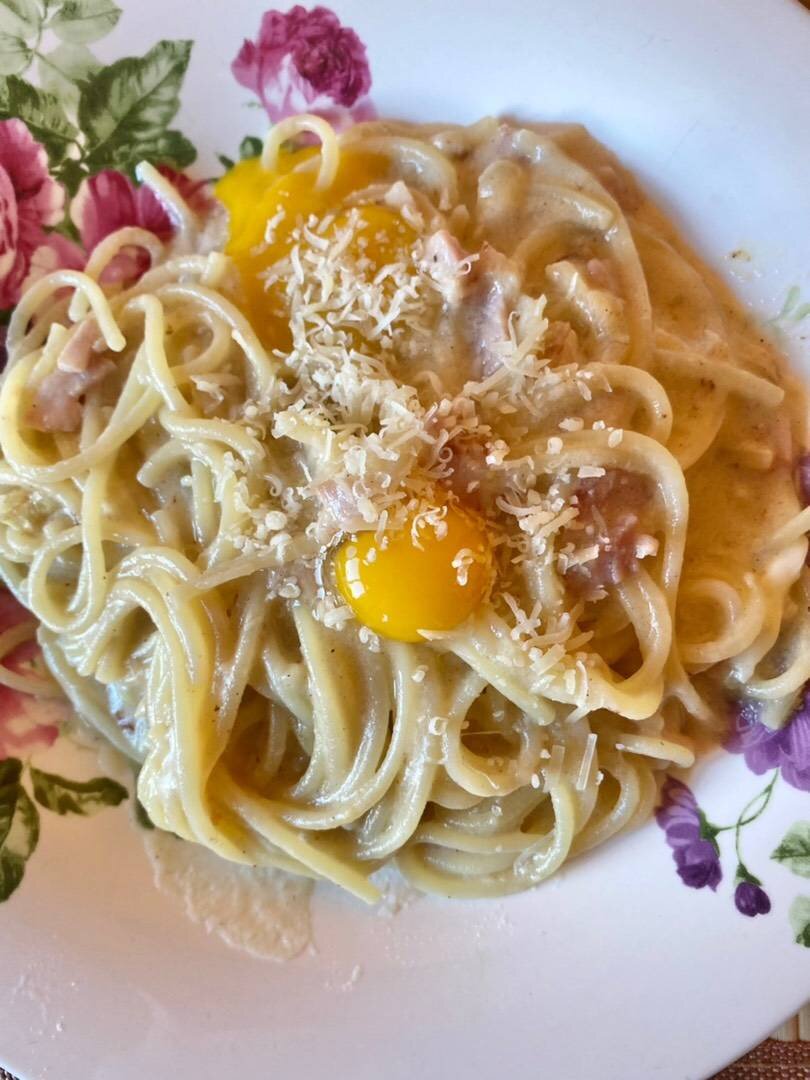 #пастакарбонара Ингредиенты: Паста (макароны длинные), гр Ветчина, Лук репчатый, (2 ст. ложки) можно побольше Сыр тертый ☺️, Соль, мускатный орех, Соус:, ложка Сливочное масло, Оливковое масло, Мука, Молоко, Желтки (перепелиные яйца) Способ приготовления: Лук и ветчину обжарить до золотистого цвета, отложить, поставить варить пасту и займёмся соусом. Масла соединить добавить муку соль мускатный орех, далее добавляем понемногу молоко, когда соус загустеет добавим сыр тертый и лук с ветчиной. Затем готовые макароны, если соус густой добавим воды в которой варились макароны. И желтки можно в сковородку можно порционно ! Ну и сыр можно добавить. Приятно аппетита 😘.