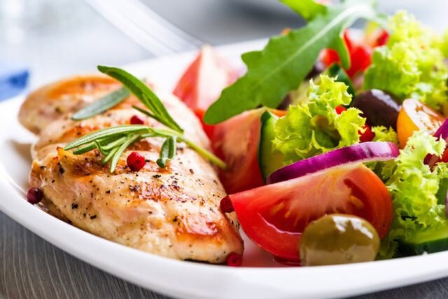 И на самом деле речь пойдет об очень важных вещах! Ни для кого не секрет, что куриное белое мясо при варке зачастую получается очень сухим, а все дело в том, что его переваривают. На самом деле грудка доходит до готовности быстрее, чем крылья и бедра. Но как же правильно тогда сварить курицу ПП целиком и чтобы всё мясо было не сухим и которое было бы приятно употреблять в пищу? Если вы хотите отварить одну лишь куриную грудку, то лучше сделать это на пару, достаточно поместить в кастрюлю дуршлаг, перевернув его, налить жидкость так чтобы она не соприкасалась с грудкой и готовить минут 20-30, через 15 минут можно протыкать ножом или зубочисткой на готовность, главное чтобы не шел розовый сок. Как оказалось все не так сложно, не правда ли?! Рецепт салата с курицей. Ингредиенты на 2 порции: Куриная грудка - 150гр Красный лук - 50гр Помидоры черри - 80гр Листья салата - 5шт Кинза свежая - 5гр Авокадо - 100гр Бальзамический уксус - 12гр Кукурузные чипсы - 10 шт (можно заменить тонко н