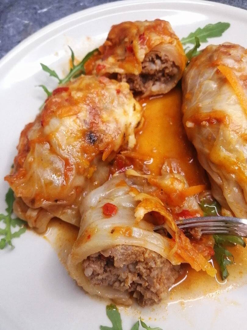 #меню Ингредиенты: капусты, Начинка:, фарша (у меня говяжий), риса отварного, лука репчатого, ч. л паприки молотой, чеснока, Соль, Перец чёрный молотый, Соус:, лука репчатого, моркови средней, ст.л томат-пасты, ч.л парики сушеной кусочками, ч.л муки, Базилик сушеный, Соль, Перец чёрный молотый Способ приготовления: Кочан капусты отвариваем в воде до полуготовности (предварительно удалив кочерыжку. Разбираем на отдельные листья, тольстые части листьев вырезаем или отбиваем. Готовим начинку : лук чистим, нарезаем мелко и обжариваем в небольшом количестве масла до золотистого цвета. Добавляем к фаршу обжаренный лук, отварной рис, соль, перец чёрный, чеснок измельчённый, паприку молотую. Хорошо вымешиваем. На листья кладём фарш, зааорачиваем в виде конверта. Соус: мелко нарезанный лук и натертую на крупной тёрке морковь пассеруем. Добавляем муку, томат-пасту, заливаем водой - 250-300 мл. Солим и перчим по вкусу. Кладём в соус специи. Провариваем пару минут. В форму для запекания выкладывае