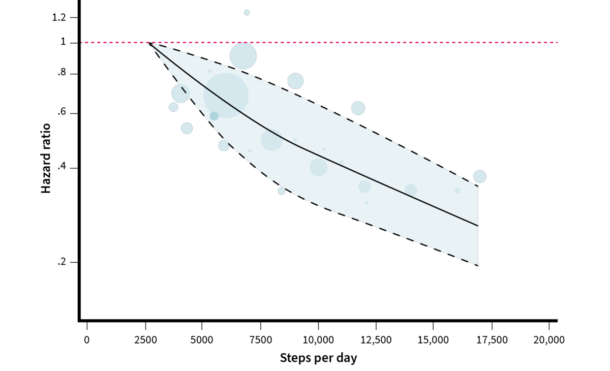 При метаанализе "дозы-реакции" была обнаружена достоверная обратная связь между количеством шагов в день (до 17 000) и риском смерти от всех причин.